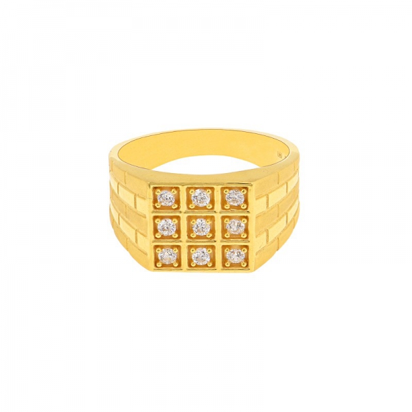 For a handsome modern look, pick this maze design cluster motif ring, encrusted with nine cubic zirconia diamonds, handcrafted in 22 karat yellow gold- a classic choice for men of style.