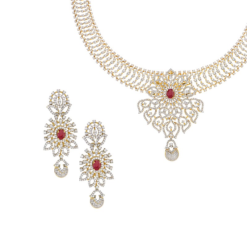 Be princess perfect in this designer diamonds encrusted necklace, features interchangeable gemstones (6.16 carats)- ruby, blue sapphire & emeralds for a diverse look. The three piece lavish jewelry set is fashioned in 18k yellow gold. The necklace is marginally adjustable in length and secures with a hook latch closure; the matching screw back drop earrings have a 1.2 mm post.