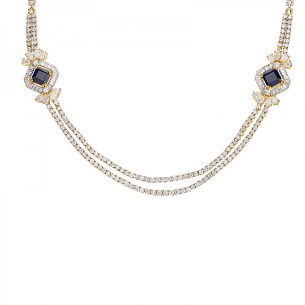 Be princess perfect in this dual layered design necklace, studded with sparkling diamonds (10.27 cts), interchangeable gemstones (32.93 carats)- ruby, emerald and blue sapphire. The lavish three piece jewelry set is handcrafted in 18k two-tone gold. The necklace is marginally adjustable in length and secures with a hook latch closure. The matching drop earrings secure with a 1.3 mm post screw back.